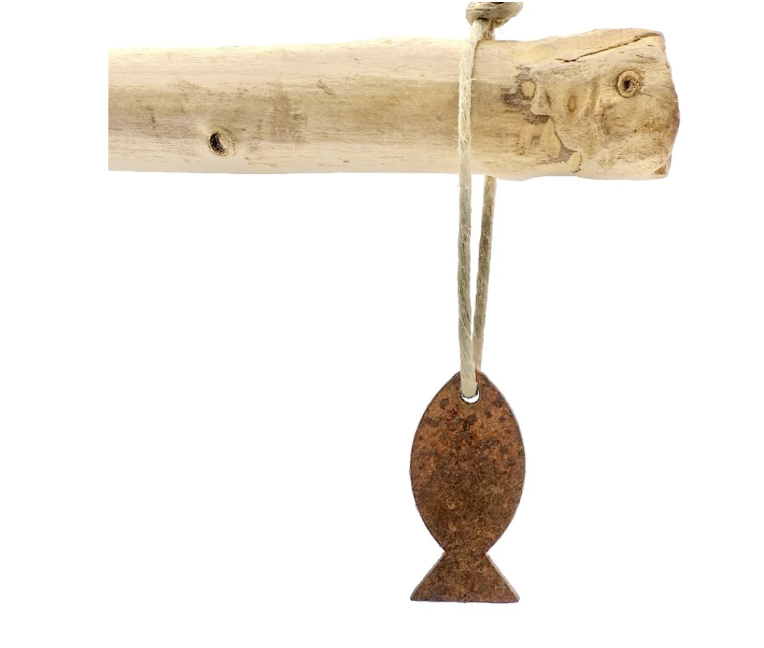 Llavero con forma de pez en hierro oxidado. Pequeño objeto para decoración o de uso como llavero.