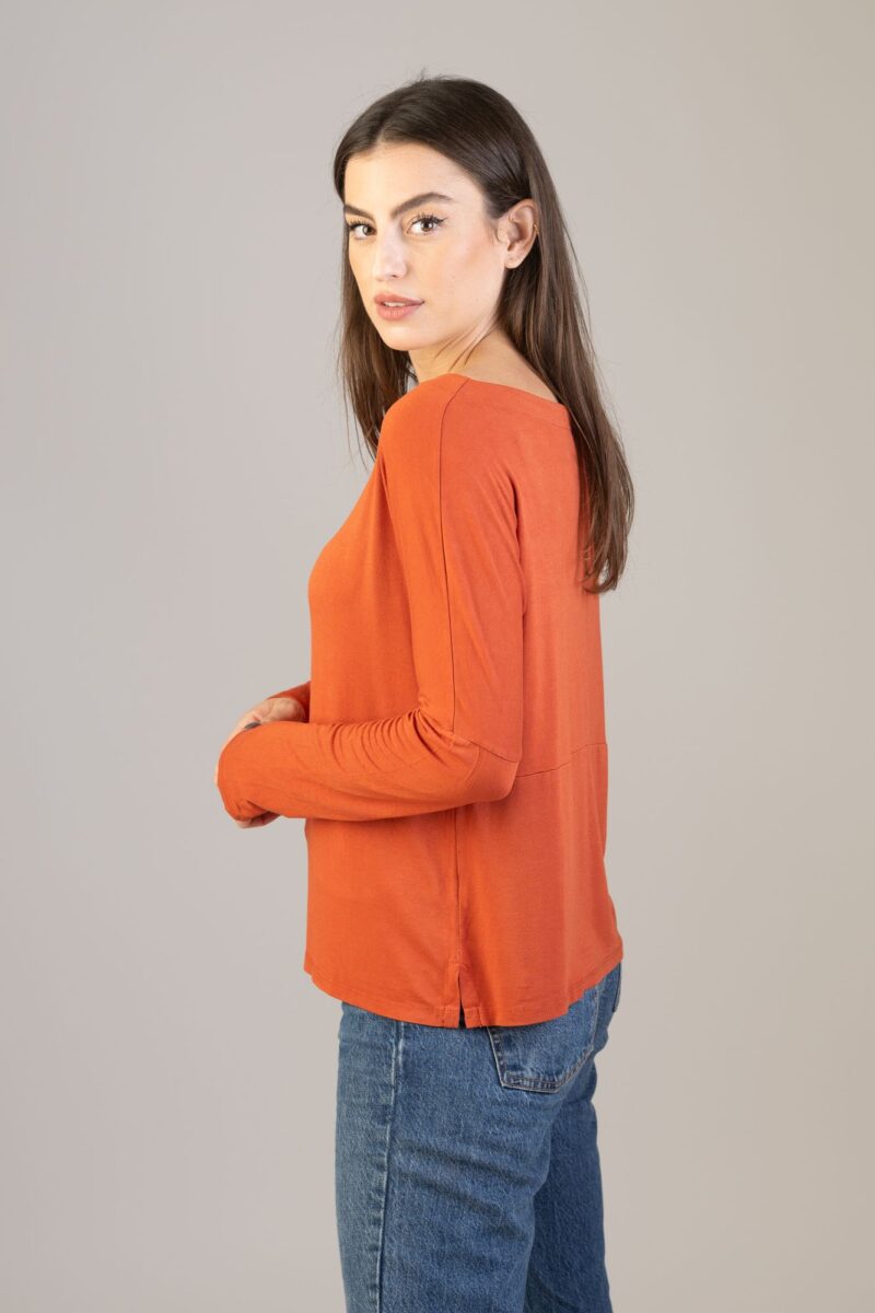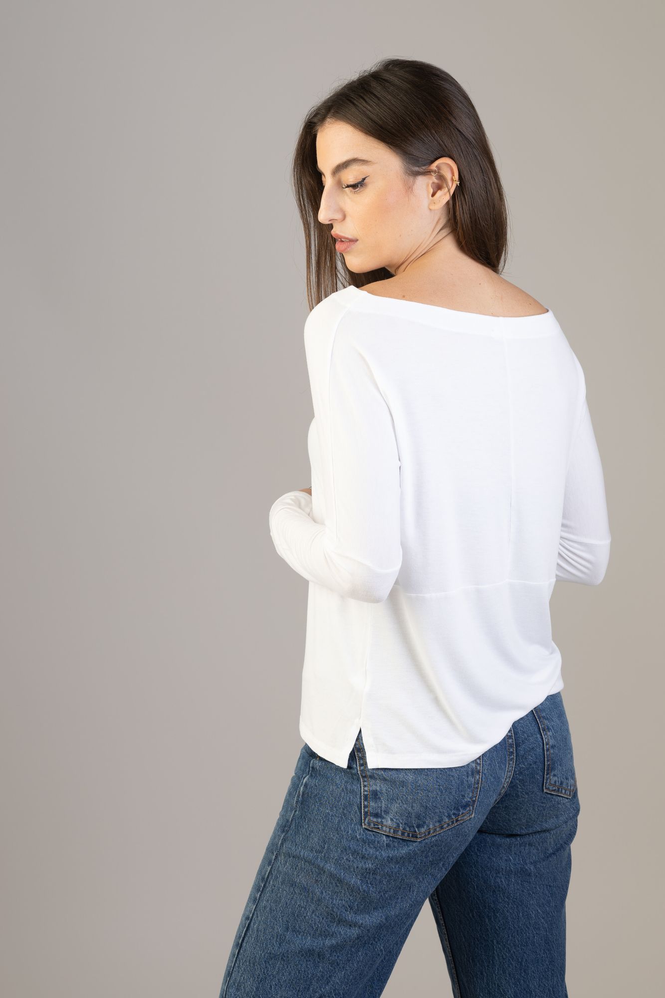Camiseta básica lisa de manga larga y cuello barca. Muy cómoda y suave, perfecta para llevar debajo de una sudadera, jersey o chaqueta. Detalle de costura.
