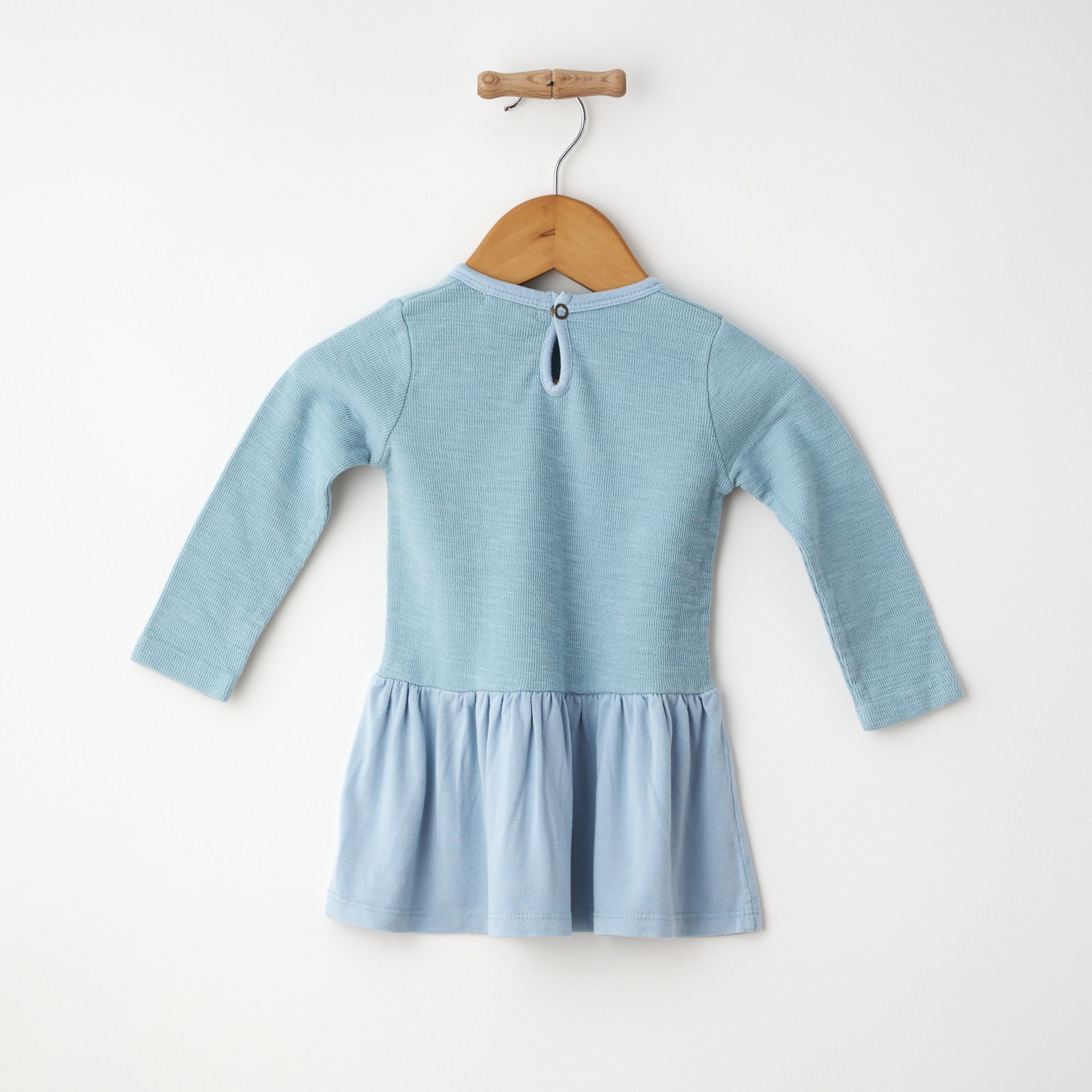 Vestido de manga larga de doble textura, algodón y viscosa de la mejor calidad. Perfecto para el invierno. Cuenta con detalle de botón en la parte trasera para facilitar la puesta. Disponible para bebés de 3 a 24 meses.